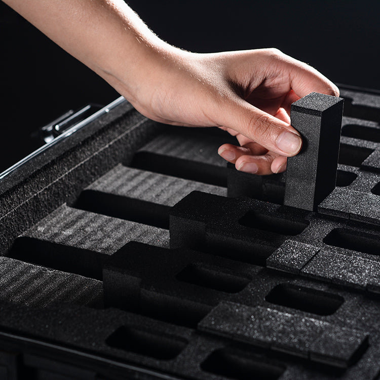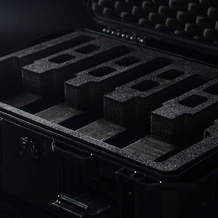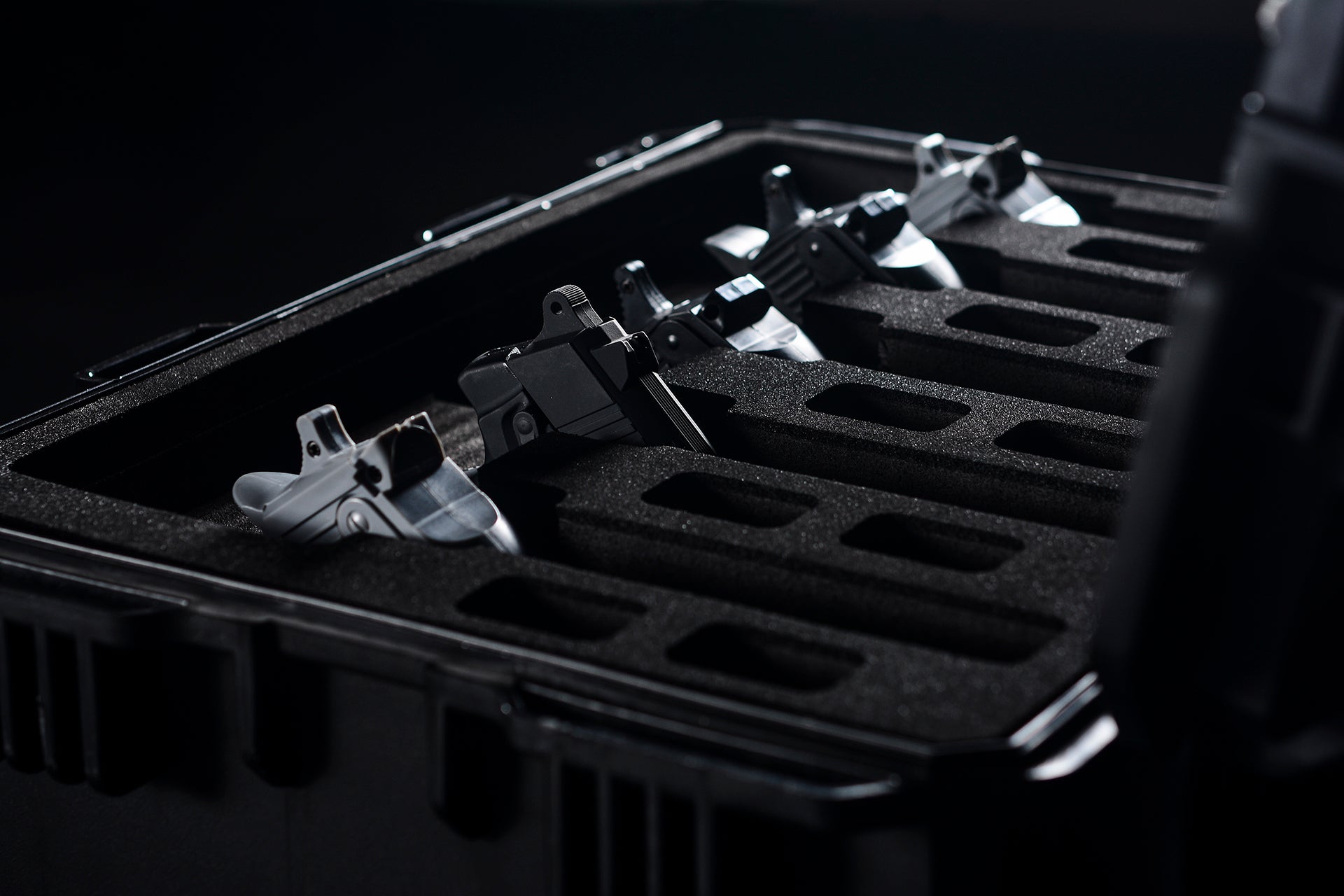 Das Pistolen-Insert aus EVA passt in den RC/RT465 und fasst maximal 5 Pistolen mit jeweils 2 zusätzlichen Magazinen. Mit Stegen können die Pistolenfache an die Pistole angepasst werden.