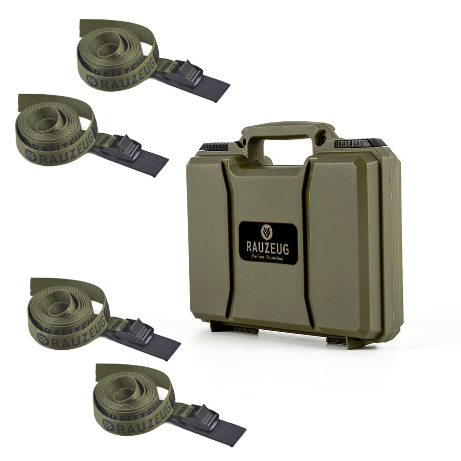 Das RAUZEUG Gurt Set besteht aus einen kleinen stapelbaren Koffer mit 4 Kompressionsgurten.