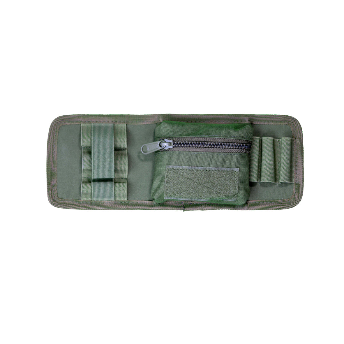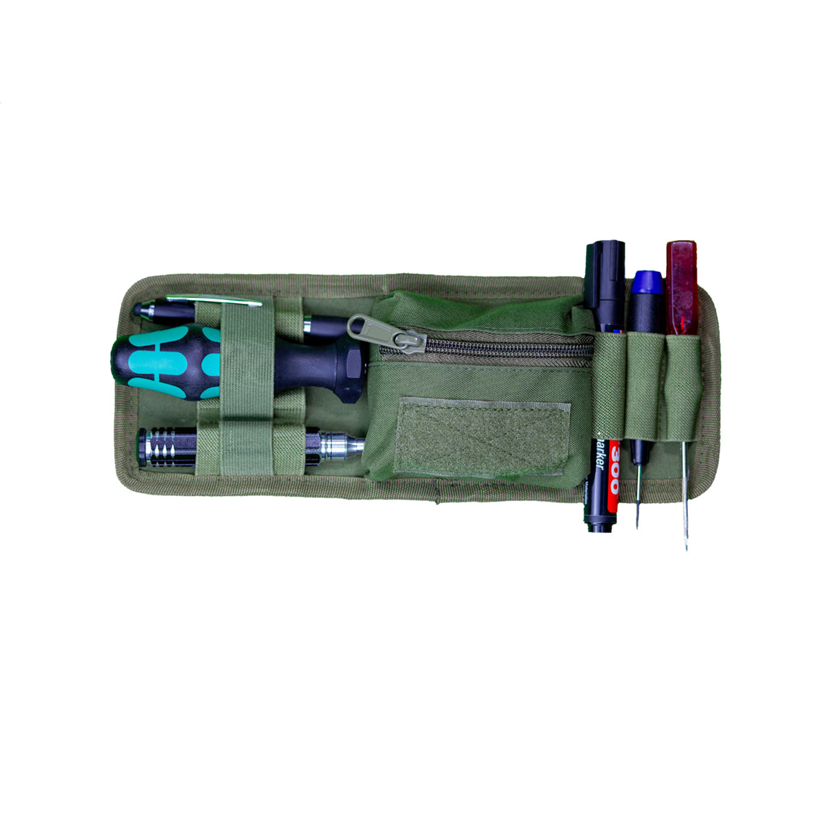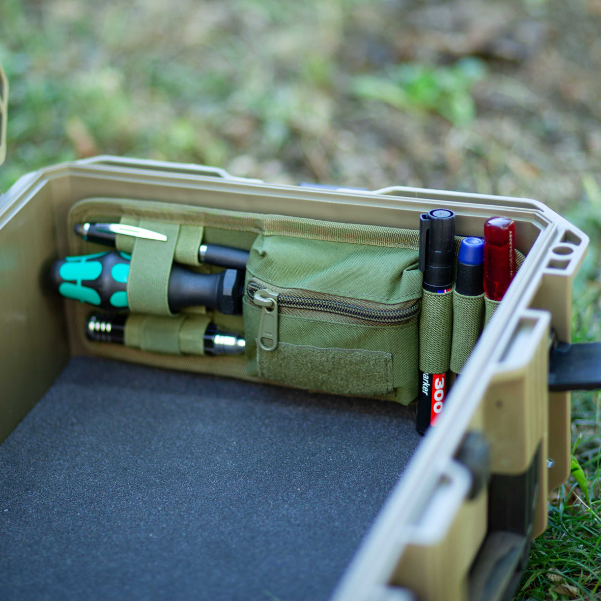 Das RAUZEUG Organizer Panel hat eine kleine RV Tasche für Knopfbatterien o.ä. Die horizontalen Stretch-Bänder halten Multi-Tool, Taschenlampe o.ä. - auch können längere Werkzeuge, wie Schraubendreher, hinter die RV Tasche durchgeschoben werden. Die vertikalen Stretch Bänder halten Stifte oder Kleinwerkzeug.